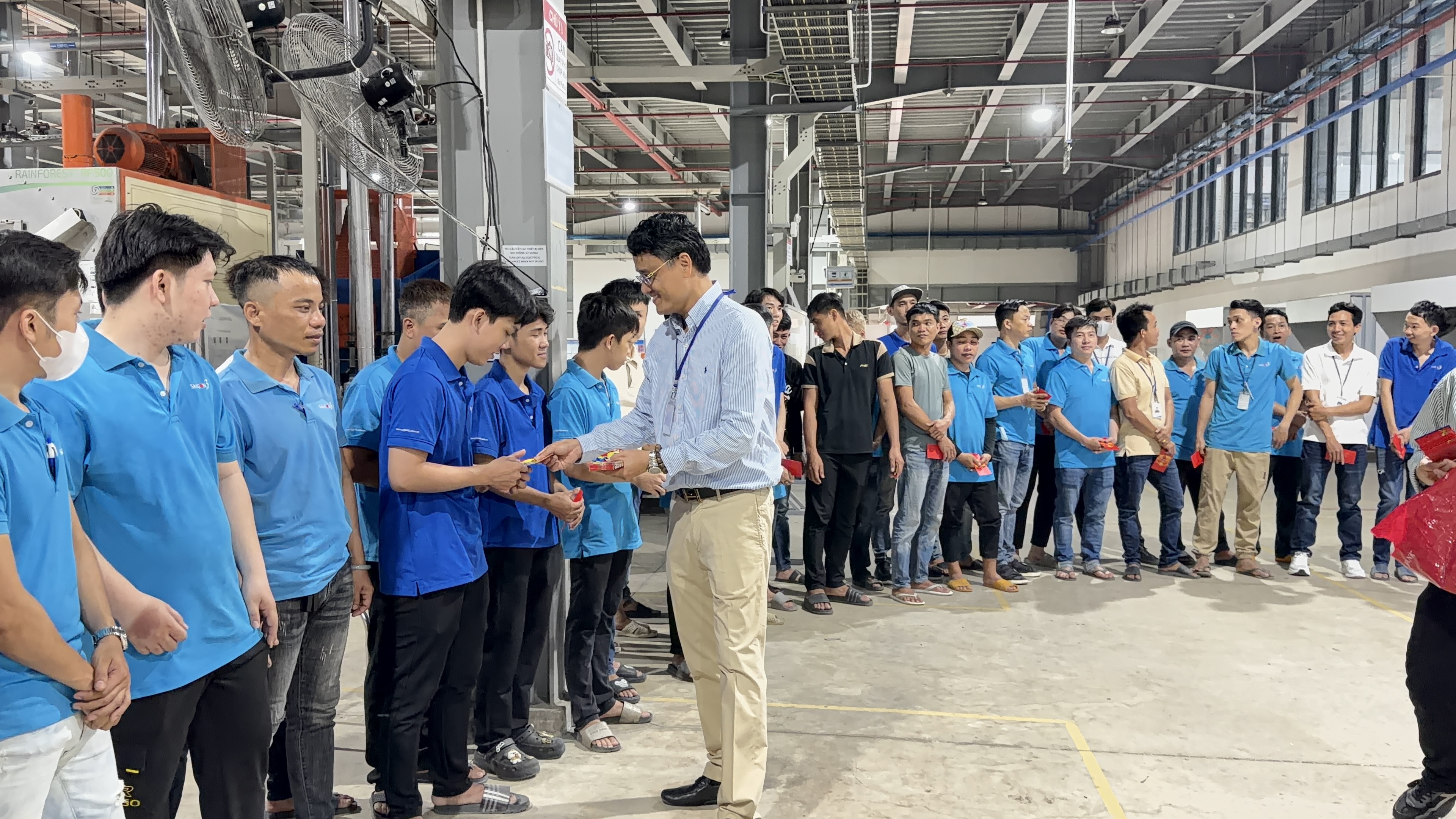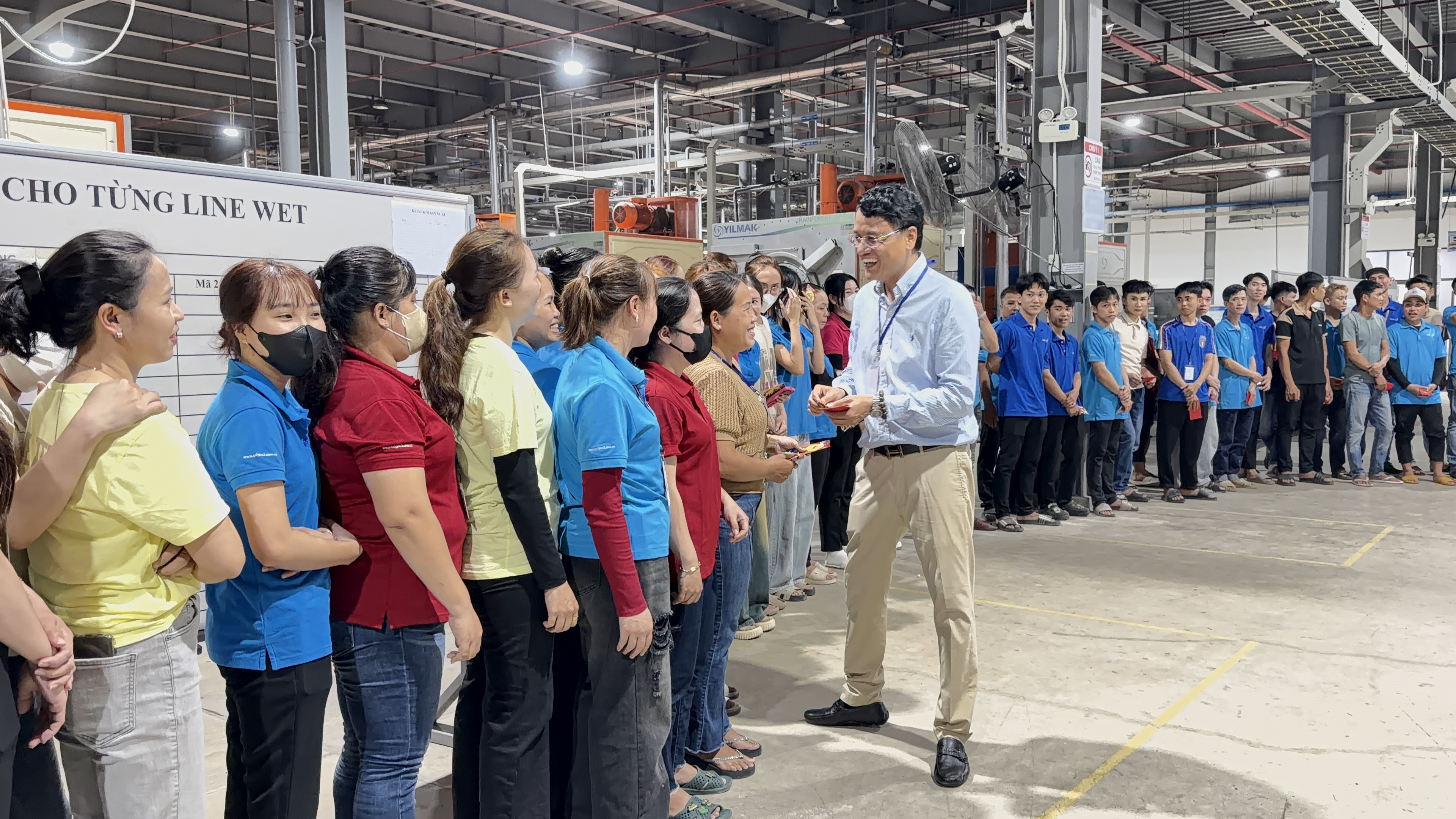 Ngay tại khu vực sản xuất, Ban Điều hành đã trực tiếp để chúc Tết và trao lì xì đầu năm cho người lao động. Hình ảnh lãnh đạo trao tận tay từng bao lì xì đỏ, bắt tay và trò chuyện cùng công nhân thể hiện sự trân trọng đối với lực lượng sản xuất – bộ phận giữ vai trò then chốt trong chuỗi giá trị của Sài Gòn 3 Jean.